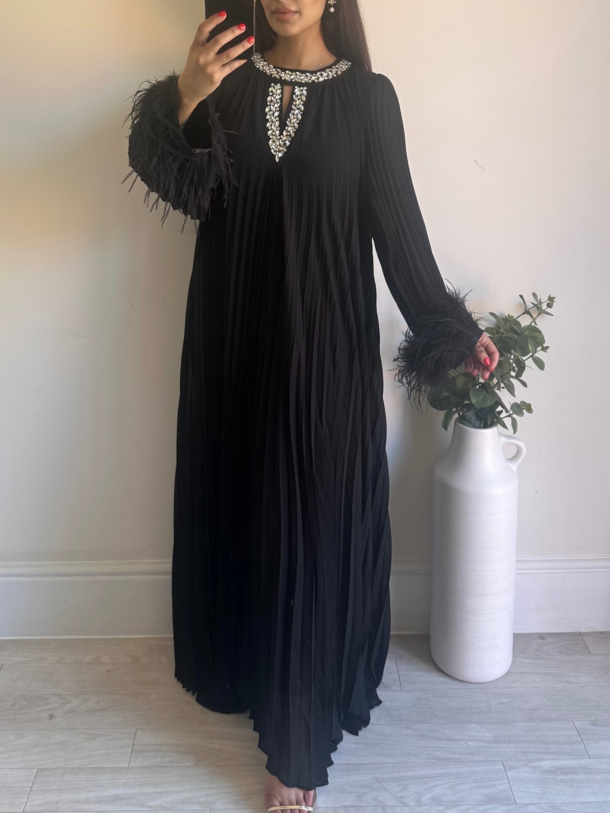 Black Fur Premium Diamanté Pleated Chiffon Dress