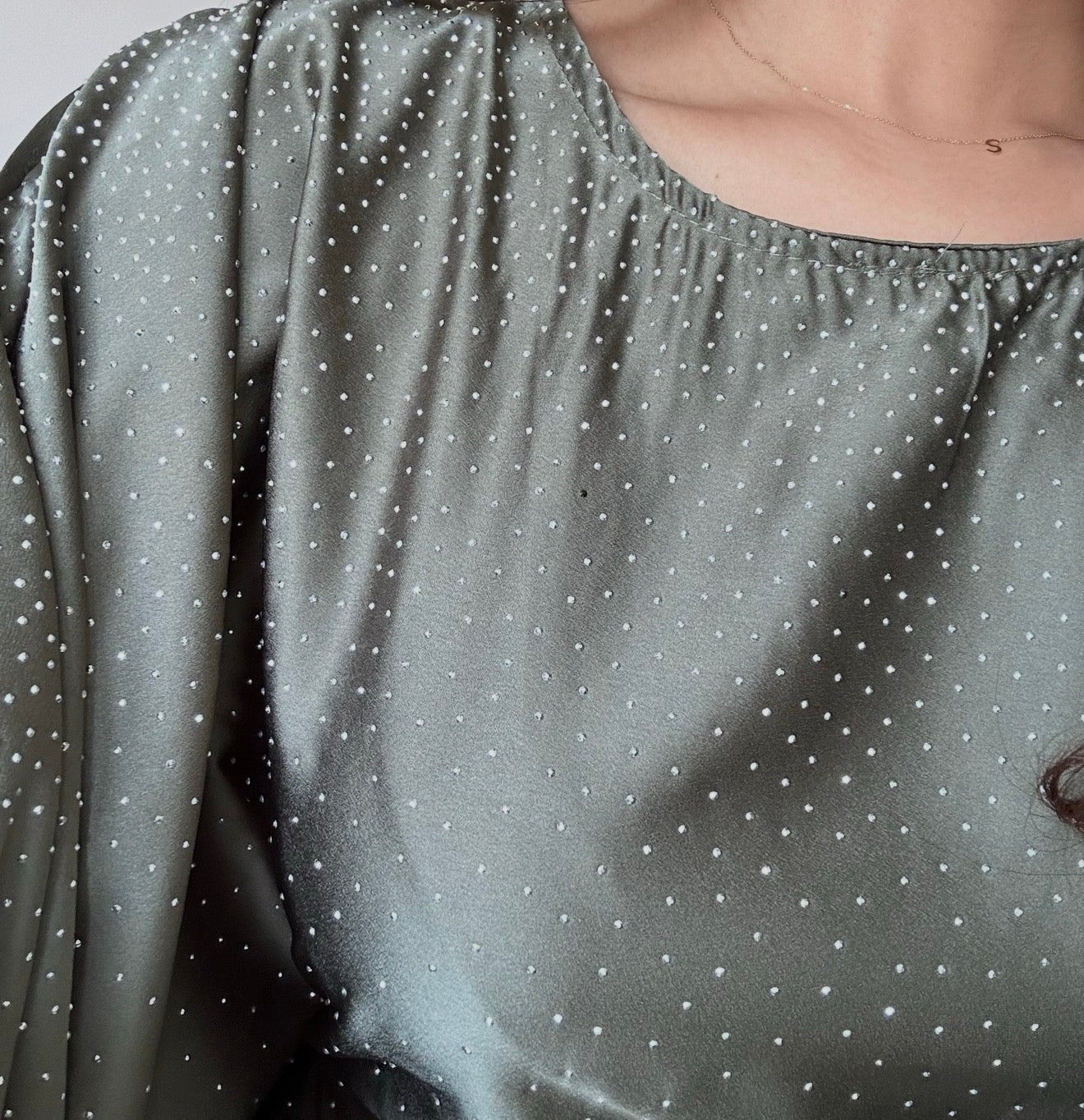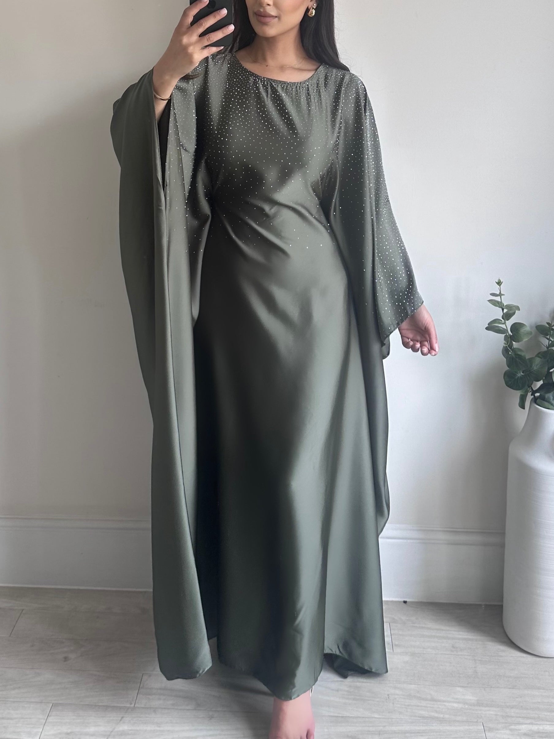Khaki Green Satin Rhinestone Butterfly Kaftan